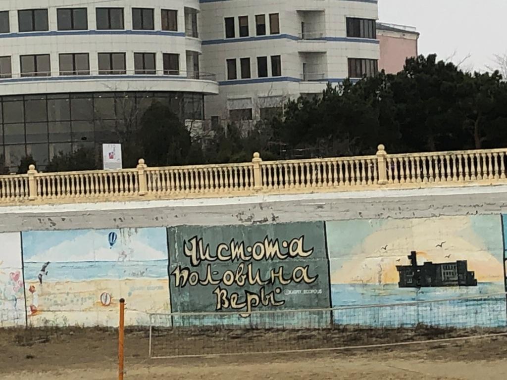 К морю вывела центральная улица Ленина, но хвалёную набережную не нашли. Был втекающий в море вонюяющий канализацией ручей и кучи мусора. Символично