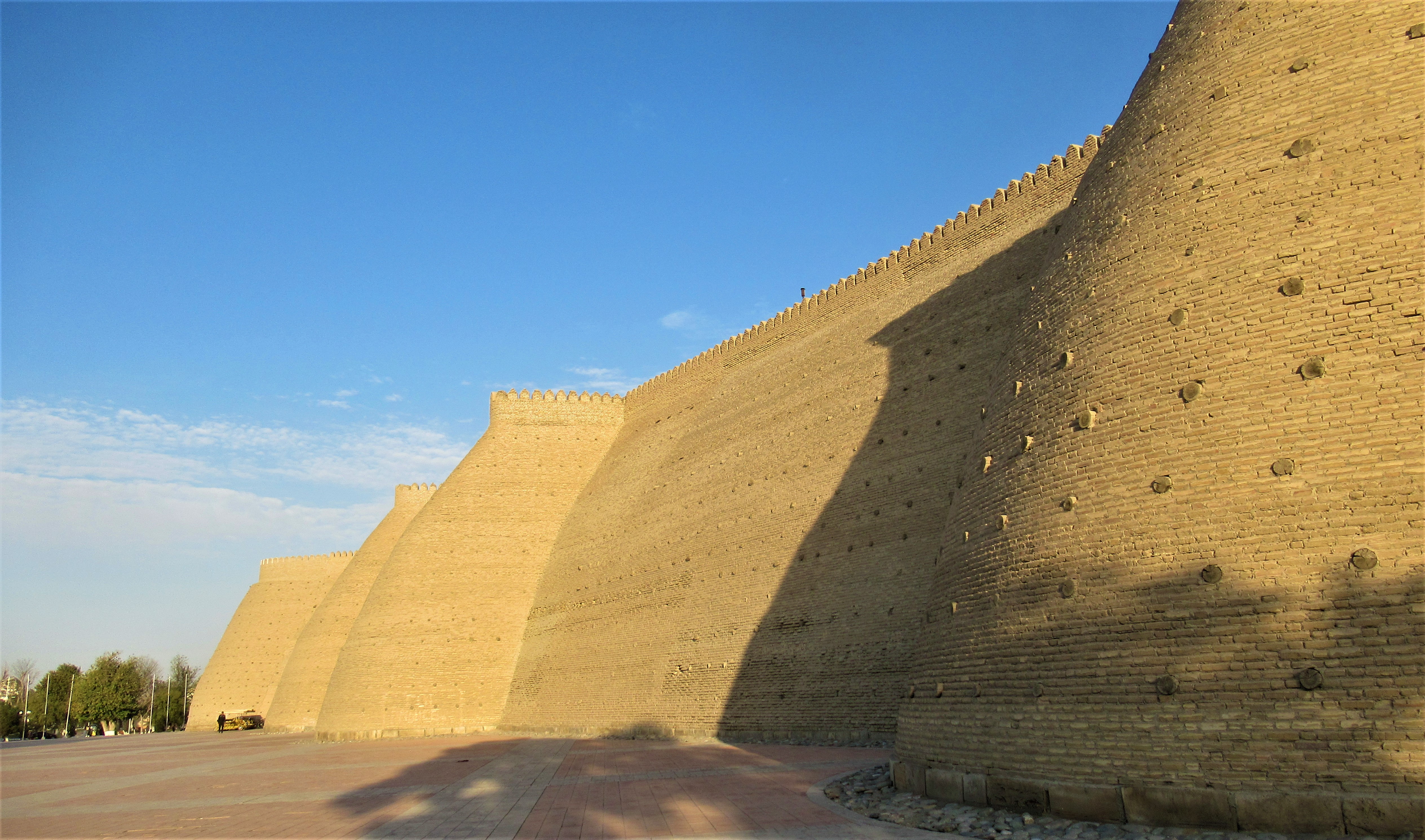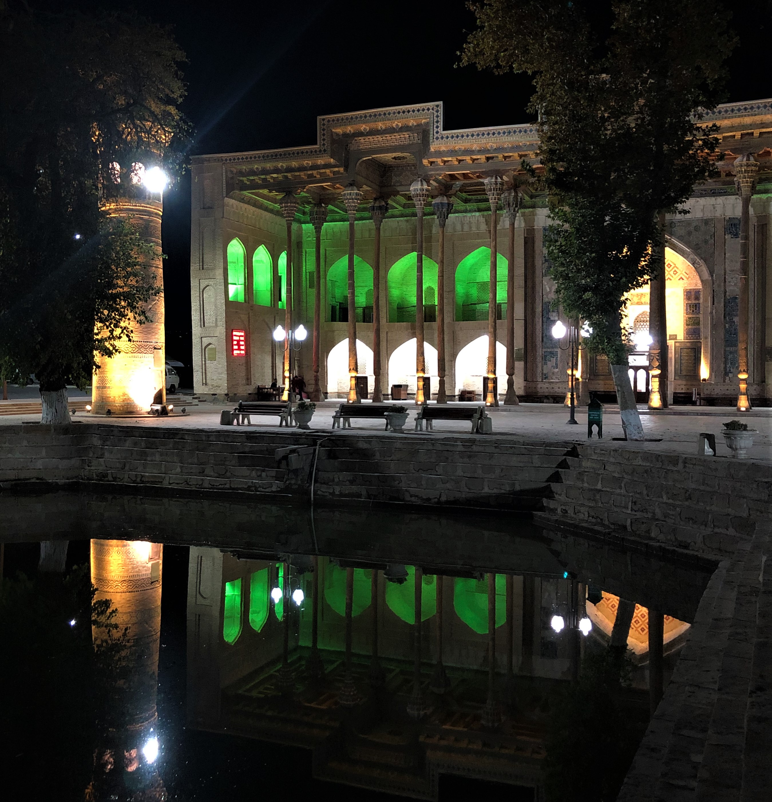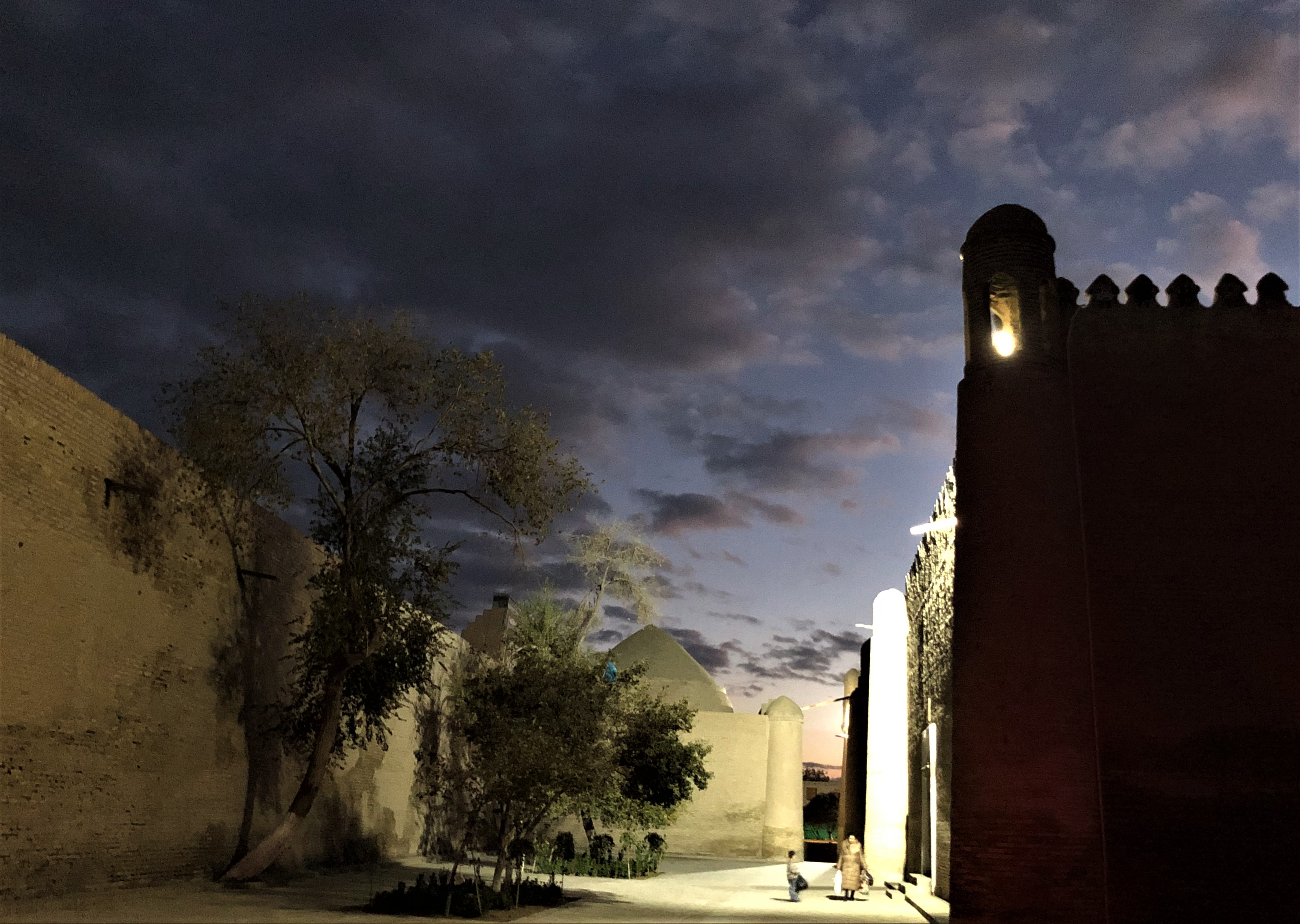 Старинная крепость, подсвеченные старинные медресе, галдящие и стрекочущие деревья.