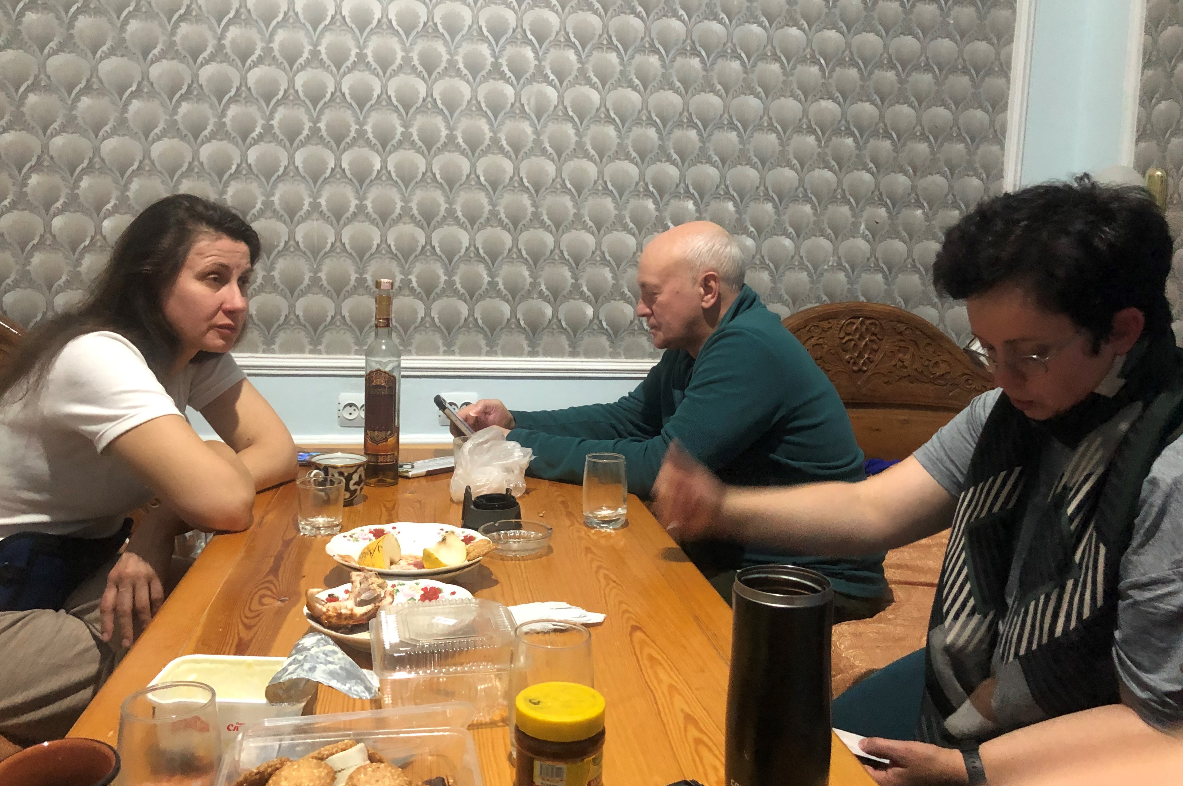 Свисающие с полок ватные матрасы; серое мятое бельё; колхозники-дехкане (как сидел вечером в углу в тёплой куртке с меховым воротником и меховой шапке, так и утром позы не изменил); перепуганные морщинистые старухи на наших нижних полках – пришлось лезть, а столик сломанный. И ароматнейшая духота на второй полке