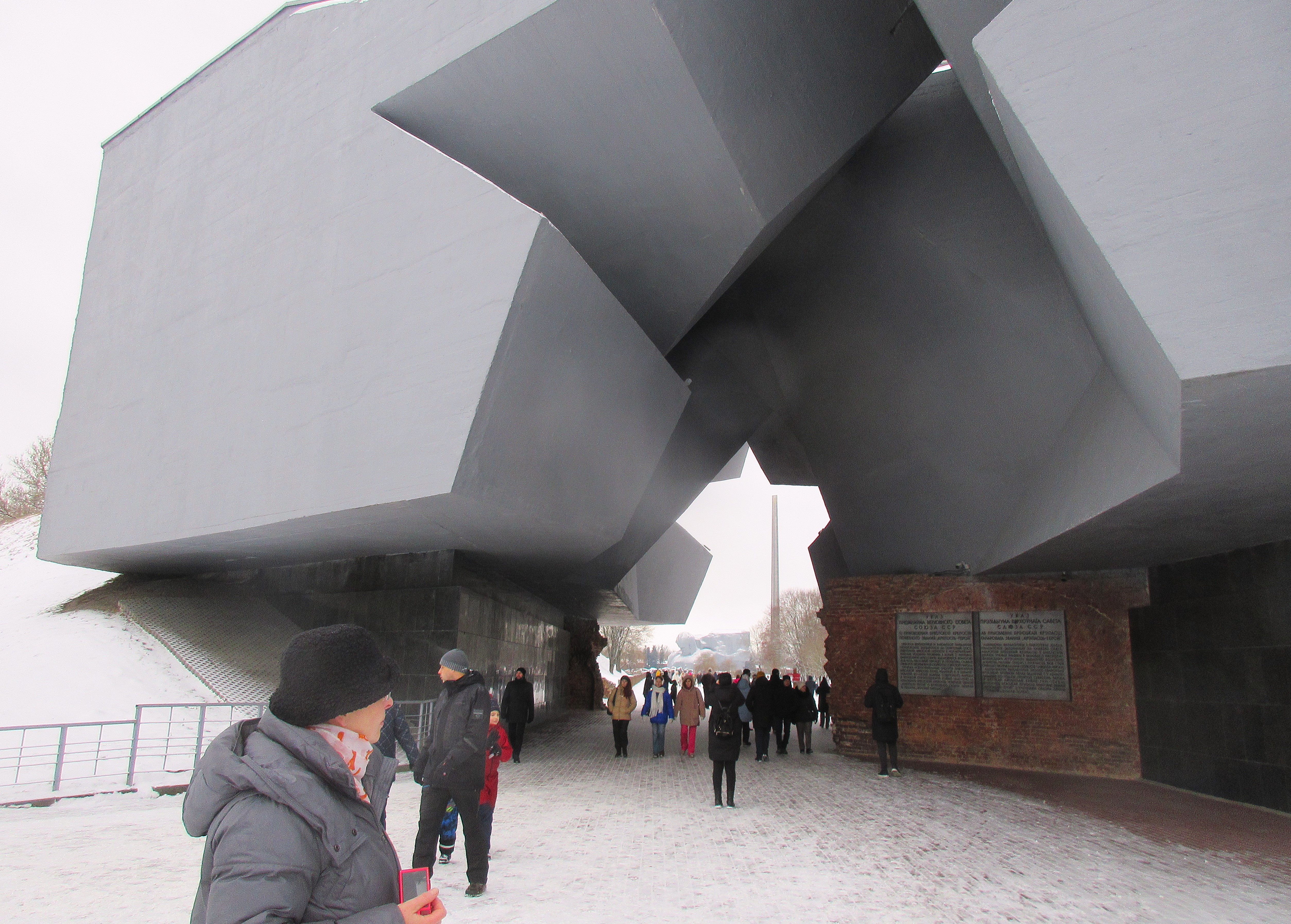 Всё как и ожидалось - знакомые с детства серая бетонная громадная звезда, метроном, Левитан, красные гвоздики. В перспективе фигура "Мужество" и высоченный обелиск "штык"