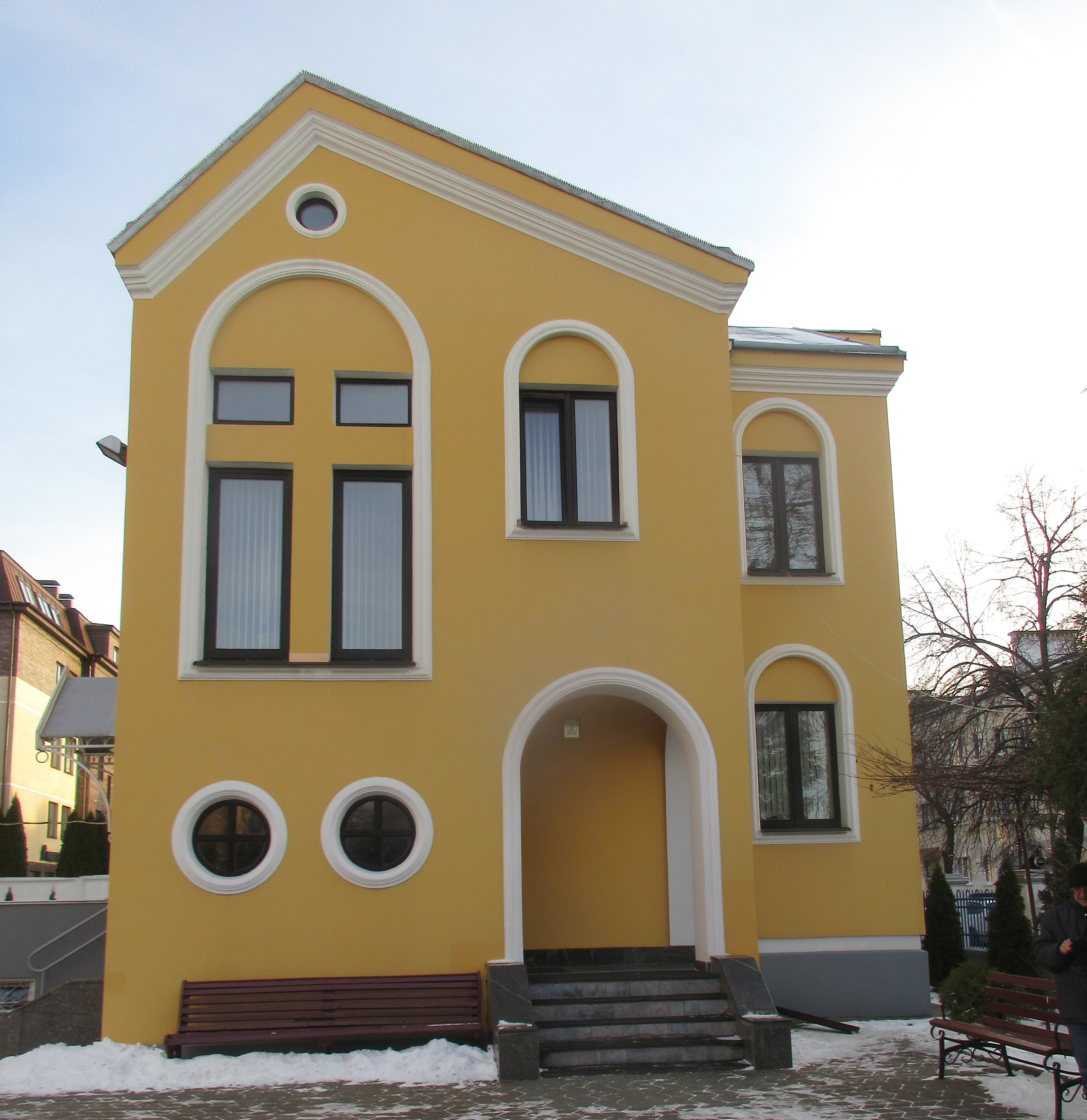 ), и тут же пластиковые окна, трубы, современная крыша, мусорные баки. И намёка нет на хоть какую стилизацию