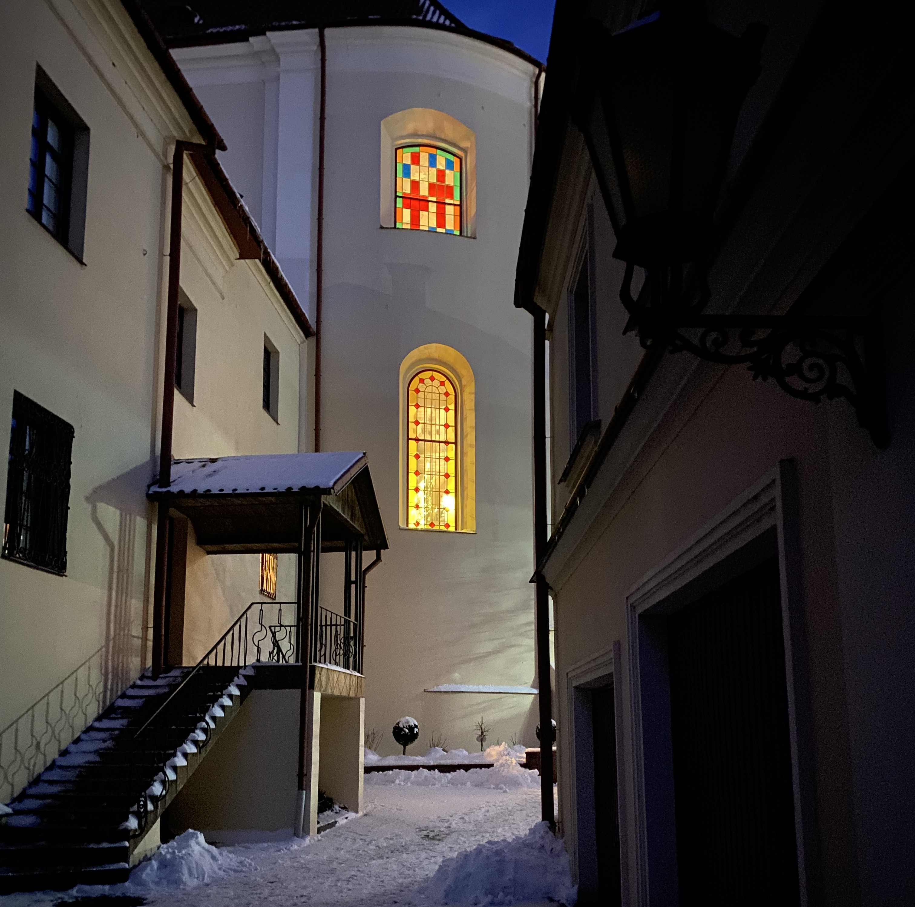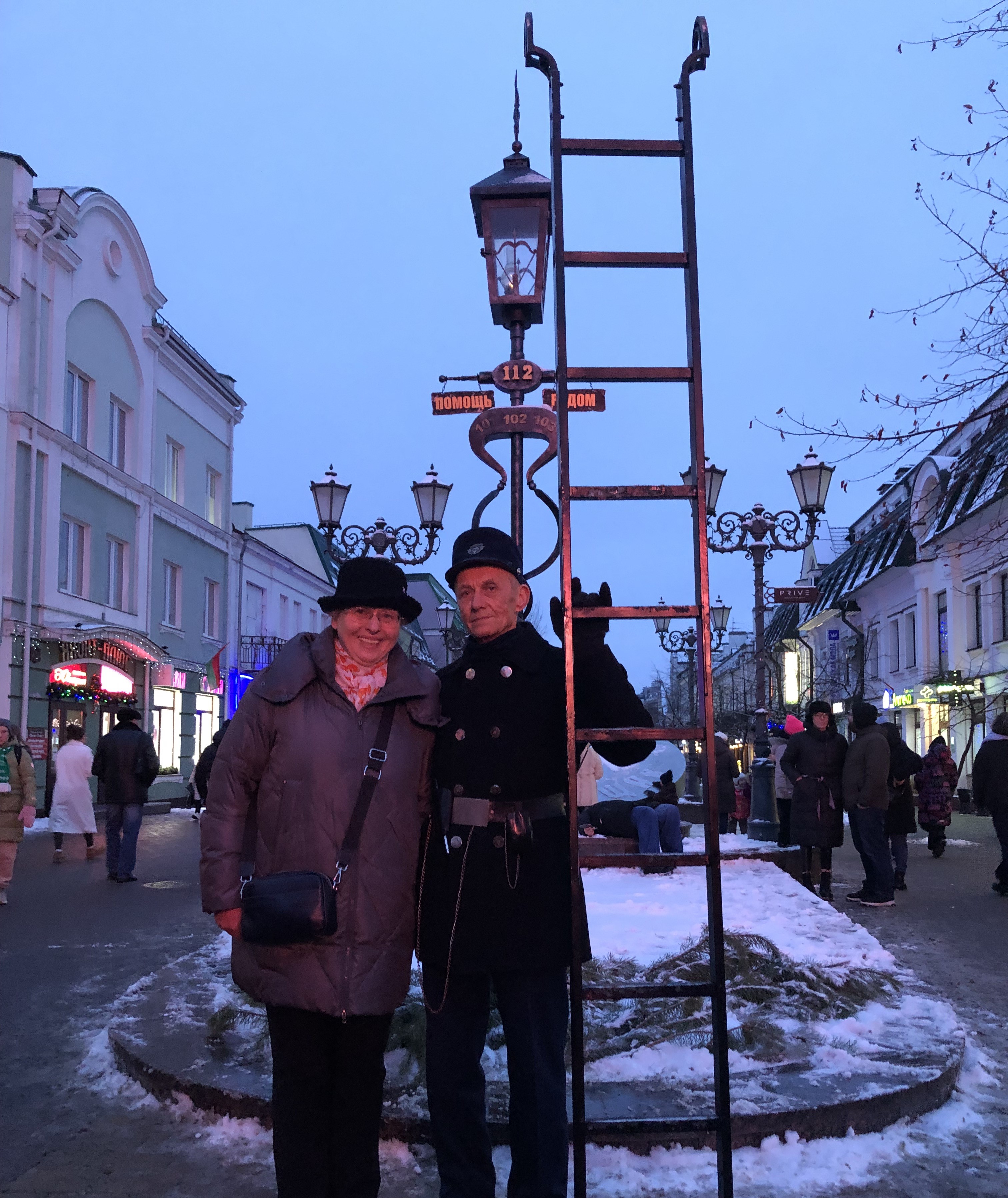 Добравшись до цивилизации и, наконец-то отобедав, удачно набрели на улицу Советскую, тутэйшый арбат, как раз ко времени зажжения фонарей. Уникальное местное шоу. Уже много лет ежевечерне из подворотни появляется фонарщик в дореволюционной форме с лестницей и зажигает керосиновые фонари. И каждое утро гасит.